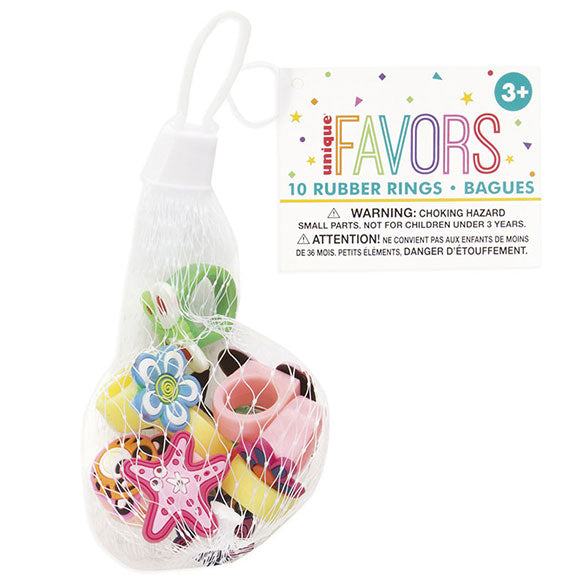 Pack de 10 Anillos de goma surtidos con formas divertidas, ideales para el relleno de la piñata de una fiesta de cumpleaños.