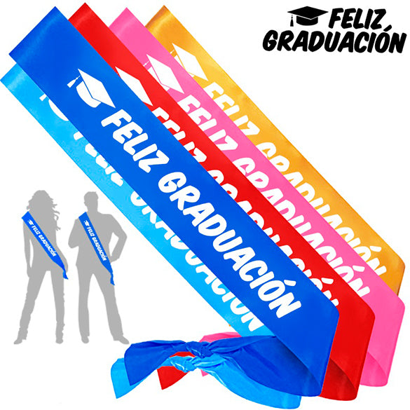 Esta Banda Feliz Graduación con el dibujo de un Birrete, es un complemento ideal para una fiesta de Graduación, sólo tienes que elegir el color que más te guste.