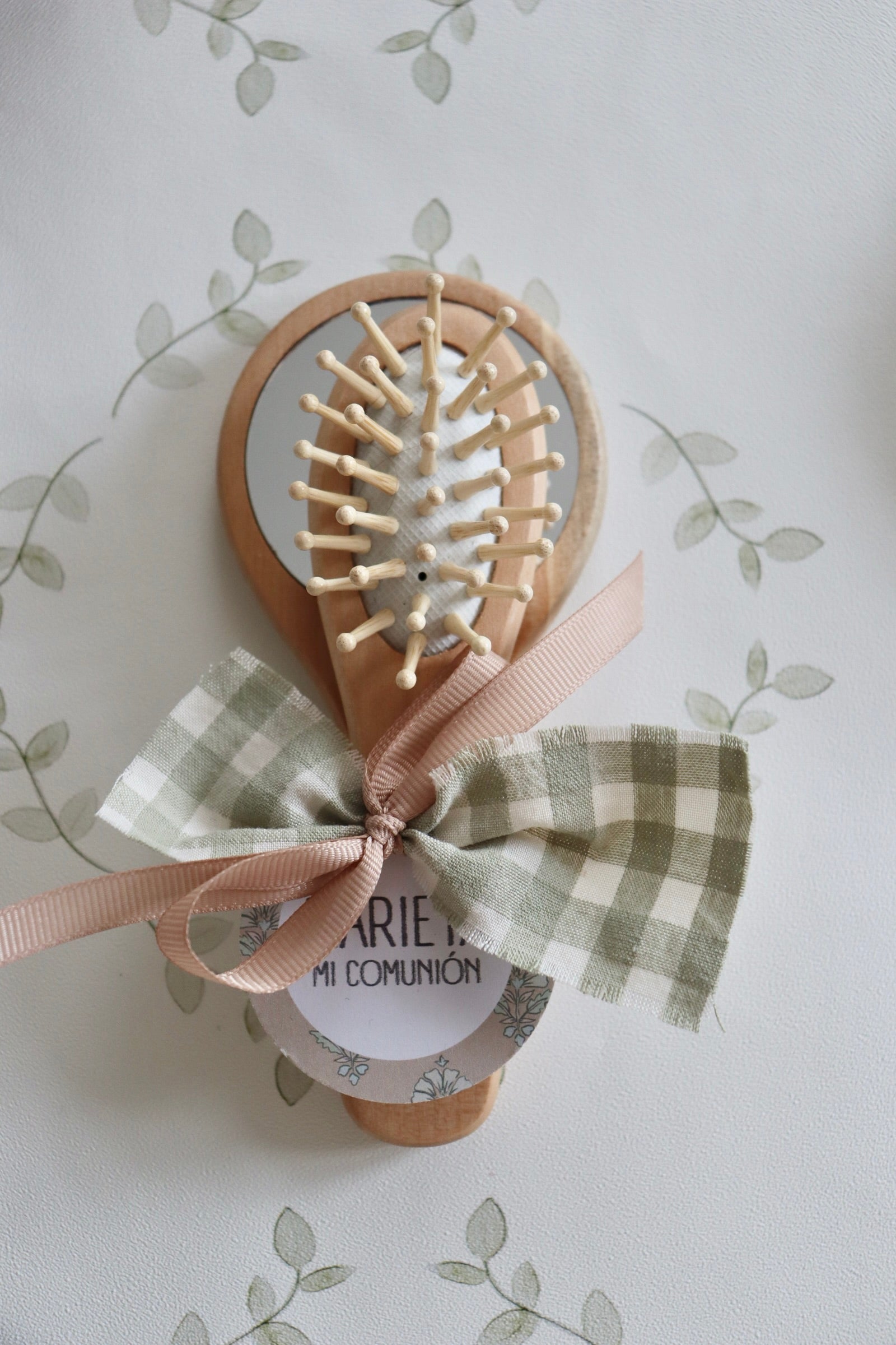 Este cepillo pequeño con espejo incorpora un diseño funcional y puede personalizarse con etiqueta con el nombre, convirtiéndose en un recuerdo bonito y útil para invitados o protagonistas del evento.