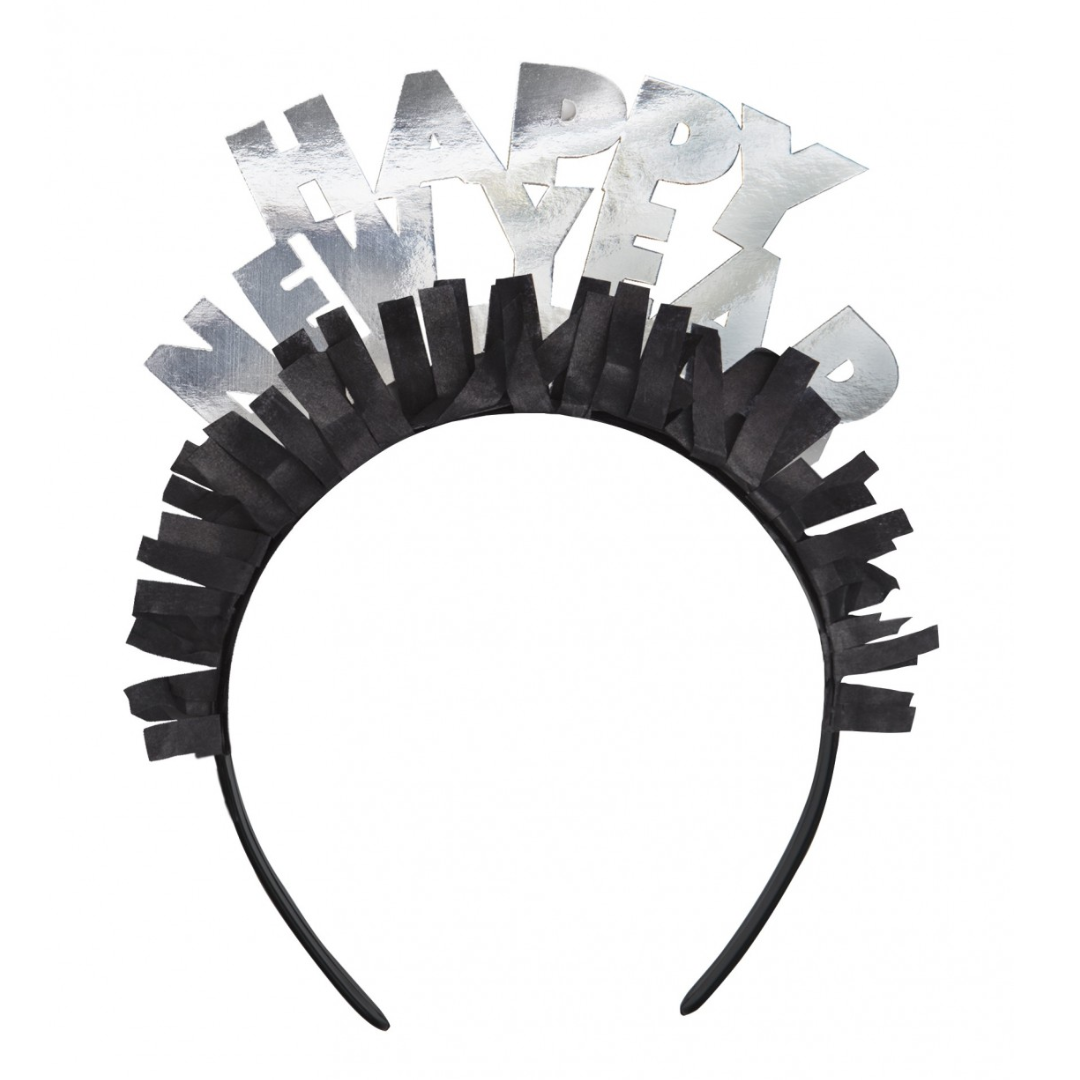Diadema de plástico negra con el texto Happy New Year de cartón dorado y plateado metalizado. Pack de 4 unidades. Ideal para destejar la entrada del Año Nuevo.