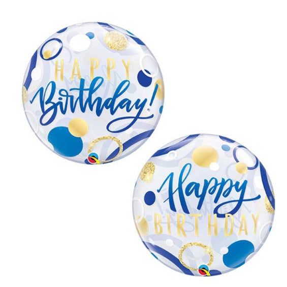 Globo de plástico elástico Happy Birthday con forma de burbuja, decorado con texto y dibujos azul y oro por toda la circunferencia.