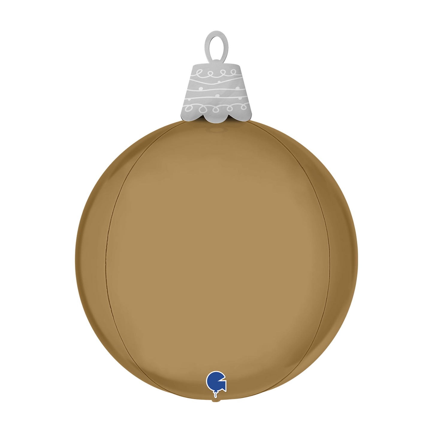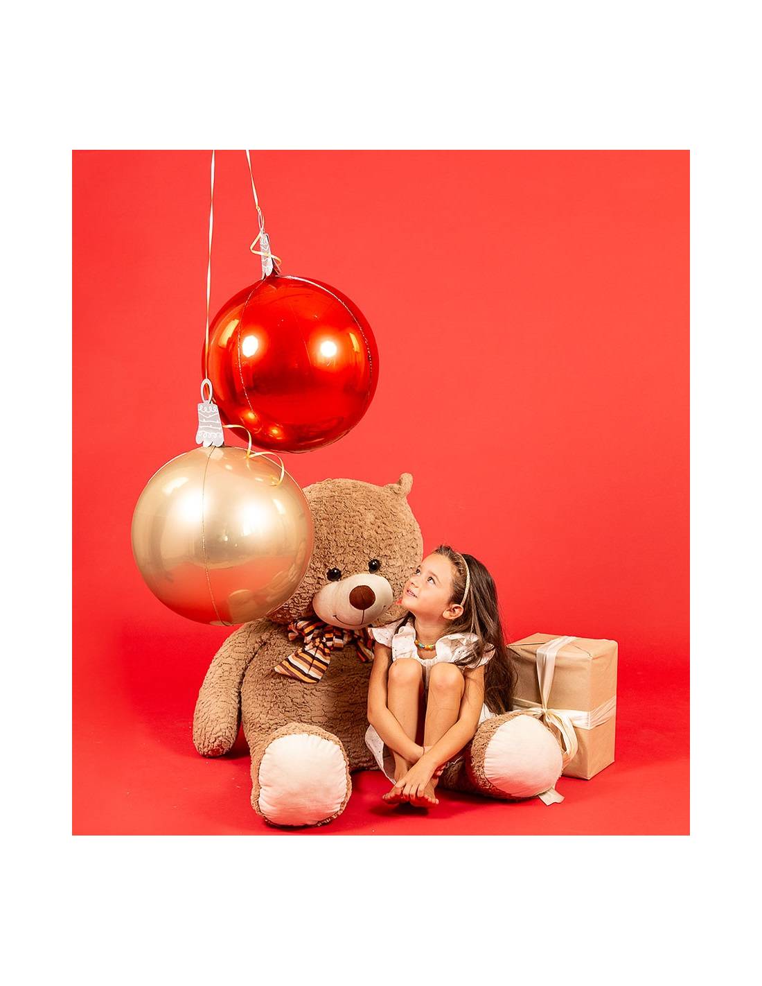 Este globo foil esfera color champagne trae un aplique de cartulina que simula la parte de arriba de una bola de navidad. Es para inflar exclusivamente con aire, ya que lo bonito de este globo es que parezca una bola de navidad XL que cuelgue del techo.