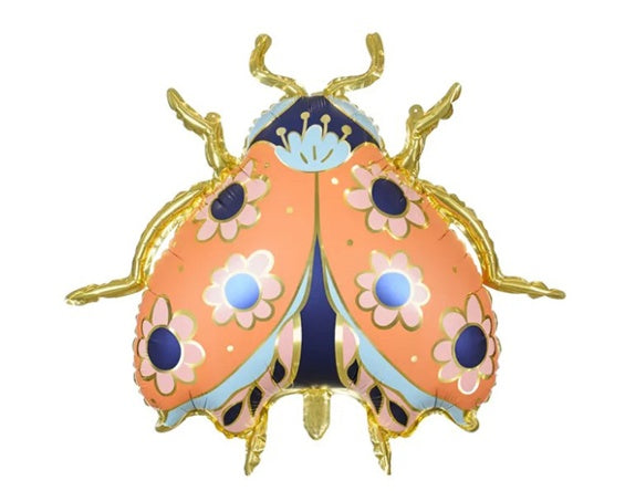 Globo metálico con forma de Mariquita color naranja con flores y detalles dorados, impreso por ambas caras.