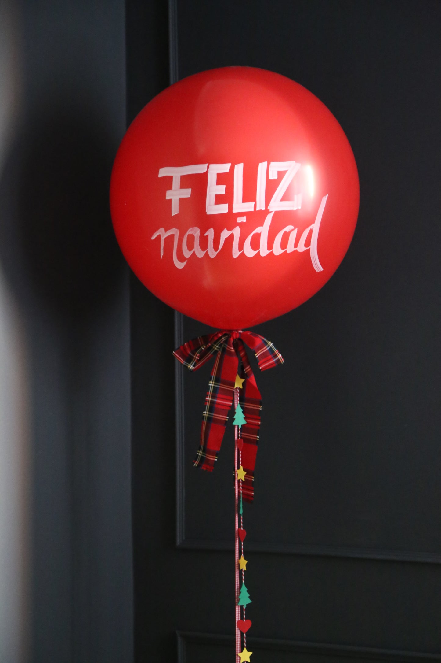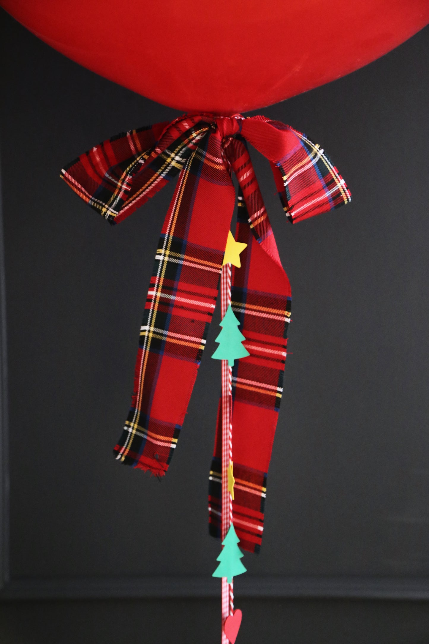 Este globo XL de látex 100% biodegradable está decorado con una cinta artesanal multiforma de navidad y un lazo tartán rojo. Puedes pedirlo sin mensaje o con personalización. Incluye Pesa. Disponible en color rojo, verde o blanco.
