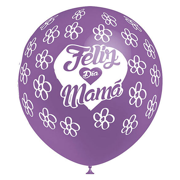Globos látex de color lila, con el texto Feliz día Mamá impreso.