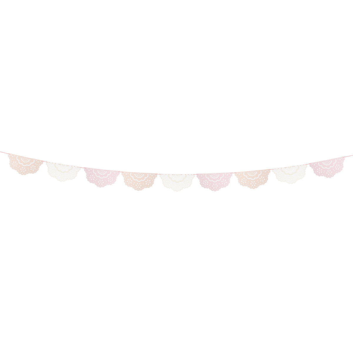 Aporta un aire delicado, romántico y muy elegante a tus celebraciones con esta preciosa guirnalda de blondas en tonos pastel. Inspirada en el diseño Broderie Anglaise, un clásico encaje que vuelve a ser tendencia, combina banderines festoneados en rosa, durazno y marfil con sutiles detalles en relieve. Es perfecta para decorar baby showers, despedidas de soltera, fiestas especiales o cualquier rincón que quieras llenar de encanto. Además, su cuidada presentación la hace ideal para regalar y reutilizar una y otra vez.
