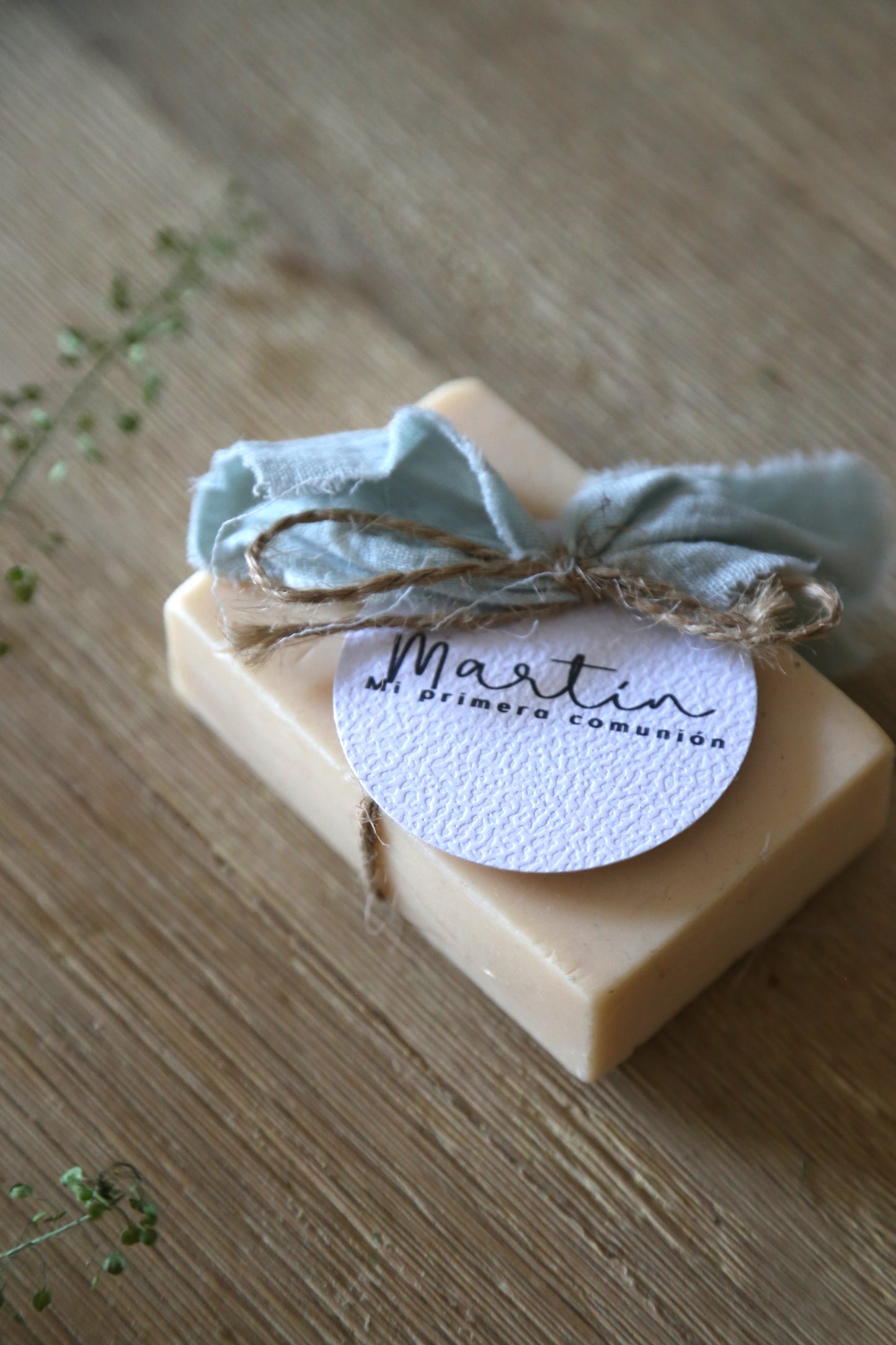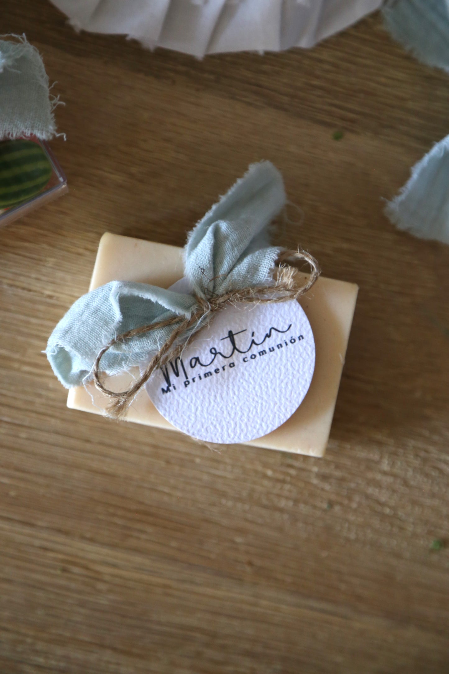 - Diseño: Jabón artesanal decorado con etiqueta redonda y lazo.