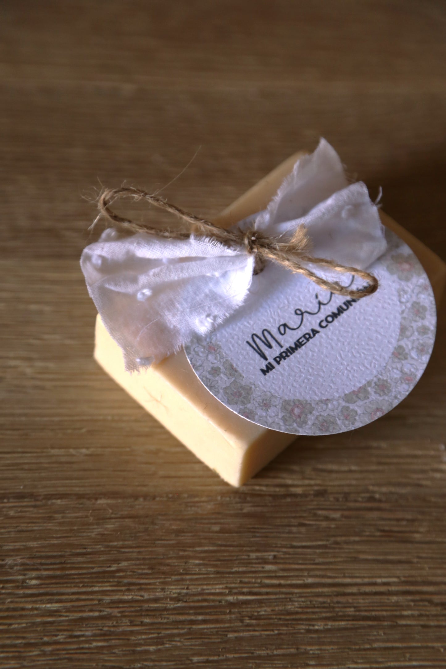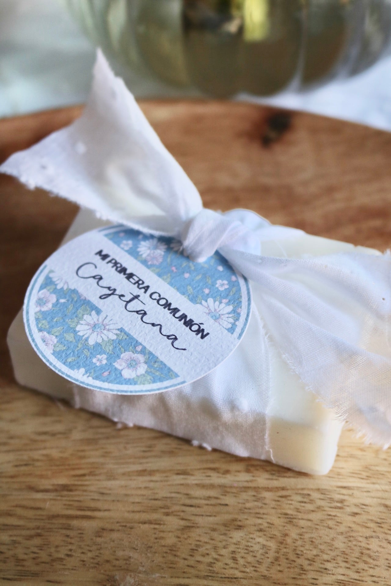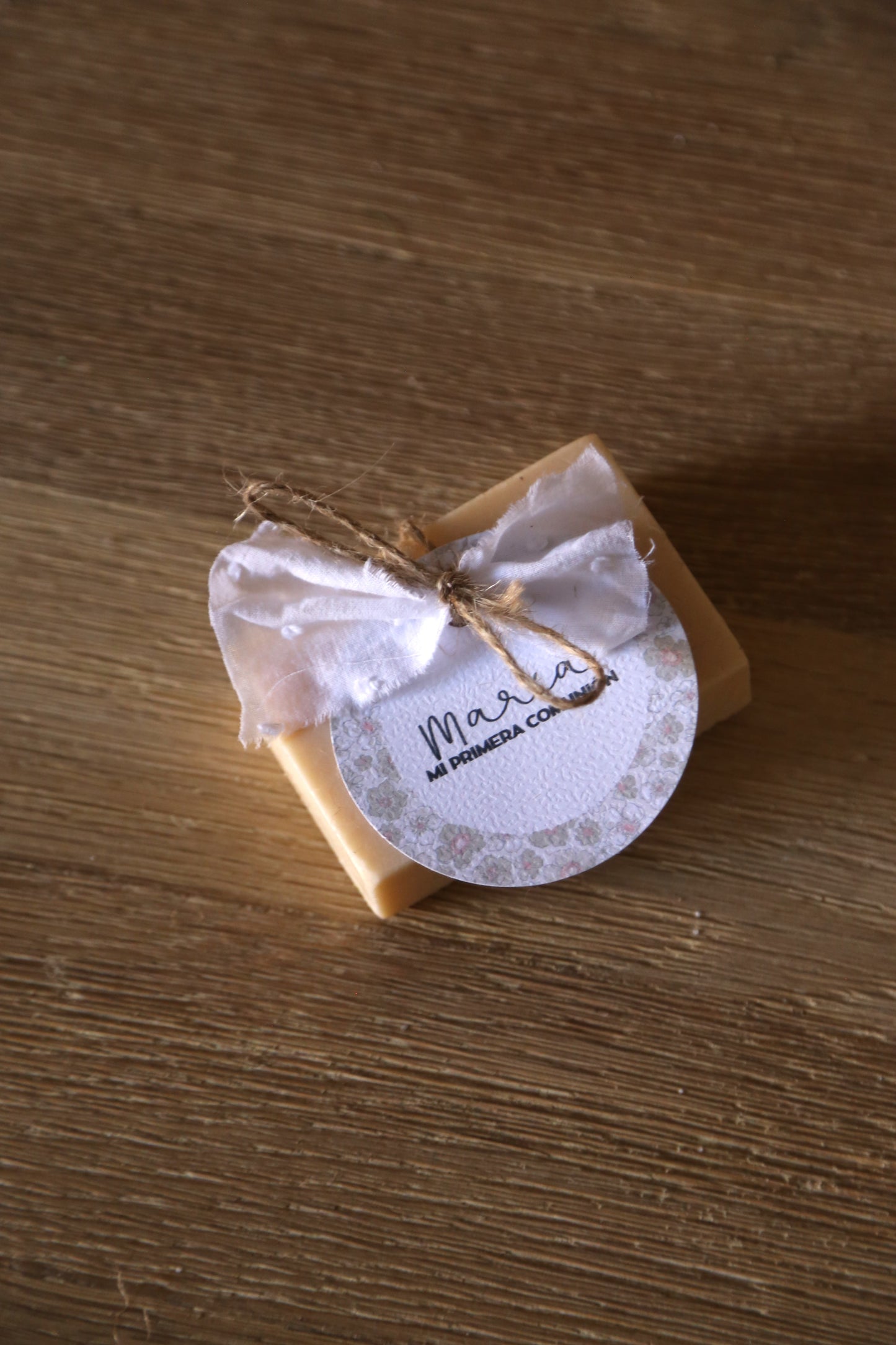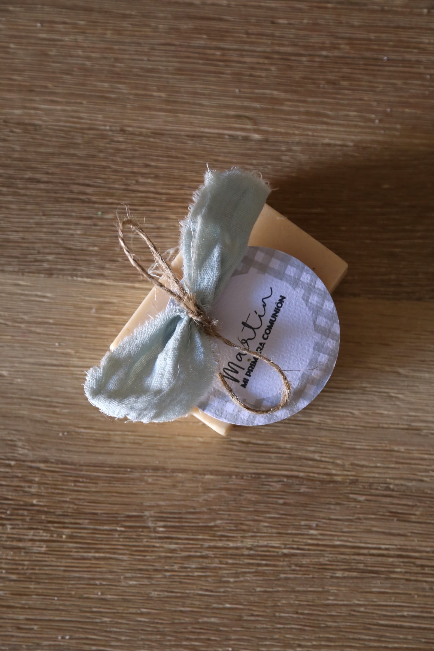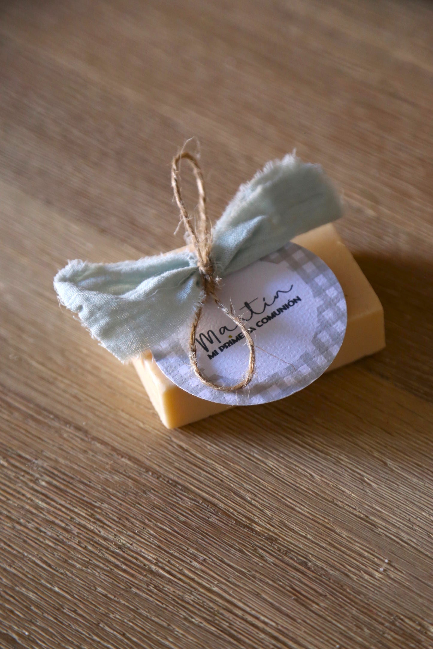 Agradece a tus invitados con un jabón artesanal personalizado, diseñado especialmente para comuniones y bautizos. Su presentación sencilla con etiqueta y lazo lo convierten en un detalle perfecto para una ocasión tan especial.