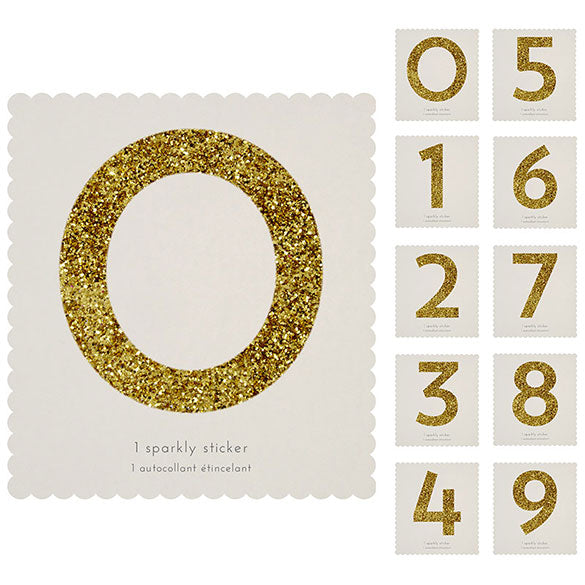 Número adhesivo dorado con purpurina, de 10 cm de alto.