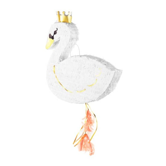 Preciosa piñata artesana con forma de cisne blanco y corona de oro brillante, ideal para todo tipo de fiestas y cumpleaños originales.