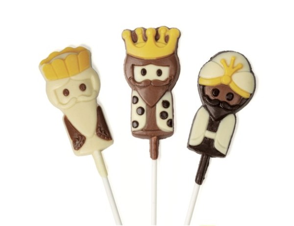 Diseño: Piruleta de chocolate con la figura de uno de los Reyes Magos (Melchor, Gaspar o Baltasar), decorada con detalles de colores festivos.