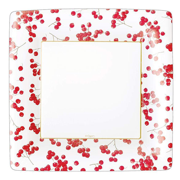 Platos desechables Navideños modelo bolitas rojas de acebo de cartón encerado cuadrado, de 26,00 cm. Apto para comida fría o caliente. Estos Platos de usar y tirar Navideños son fantásticos para fiestas de Navidad. Combina con la vajilla desechable Navideña modelo bolitas rojas de acebo.
