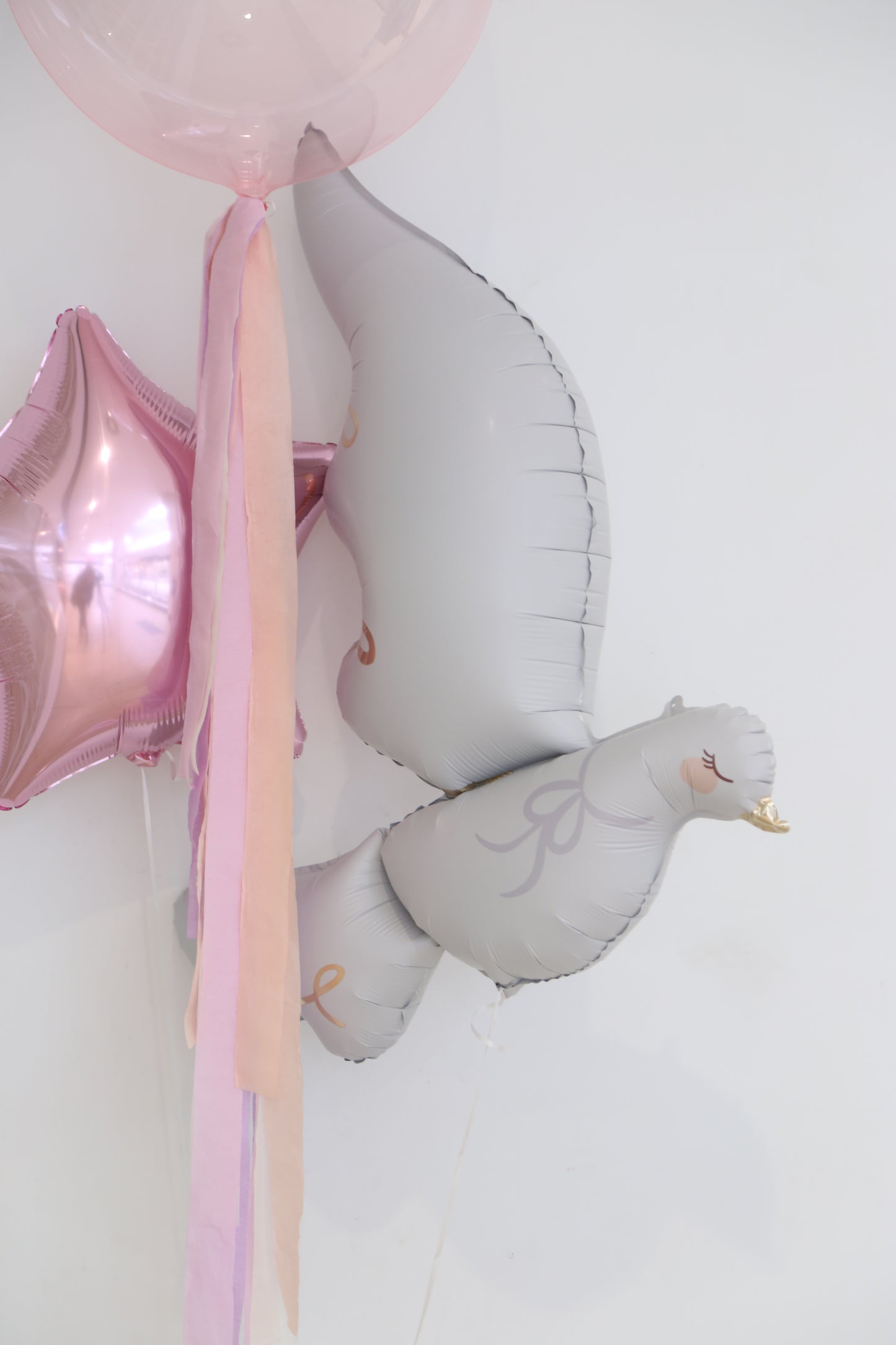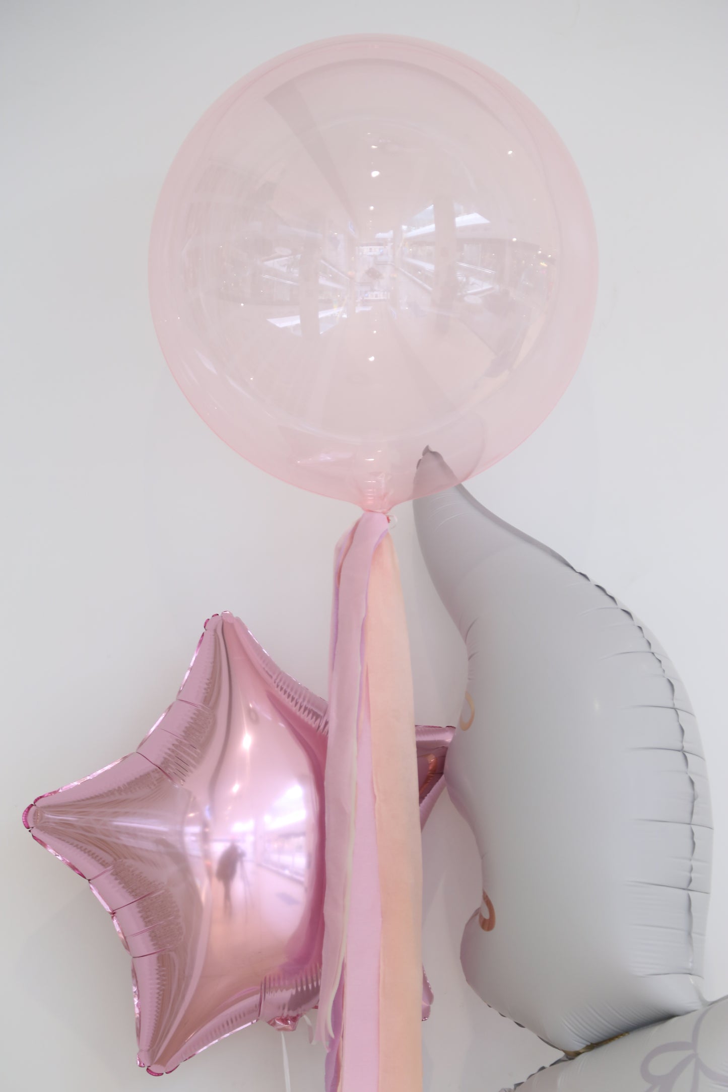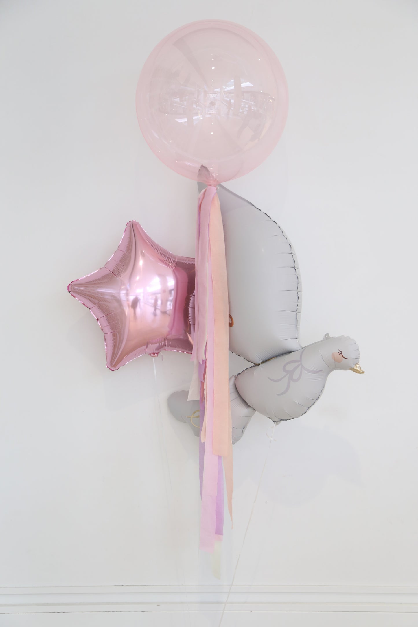 Este ramo es prefecto para un bautizo o comunión. Está compuesto por un globo burbuja rosa de 45cm, un globo foil Paloma y una estrellita rosa de 45cm y adornado con cintas de papel en colores a juego. Incluye Pesa.