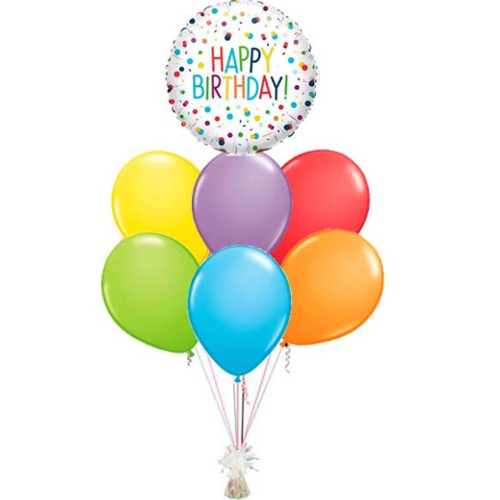 El ramo consta de un globo Happy Birthday Confeti blanco, con una válvula de seguridad y 6 de globos de látex de diferentes colores, todos inflados con gas helio Hi Float que garantiza que los globos durarán varios días inflados y en su máximo esplendor. Los globos van atados con cintas de colores a una pesa para que se puedan colocar en cualquier lugar.
