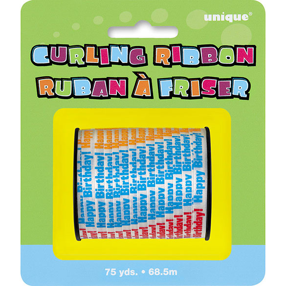 Rollo de cinta blanca con el texto Happy Birthday en colores 690 cm., ideal para atado de globos o para envolver paquetes de regalo.