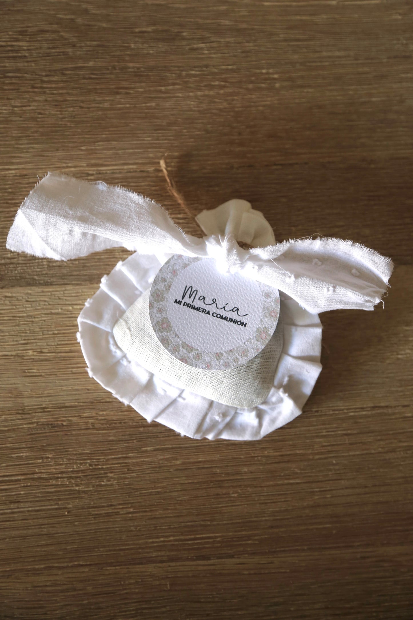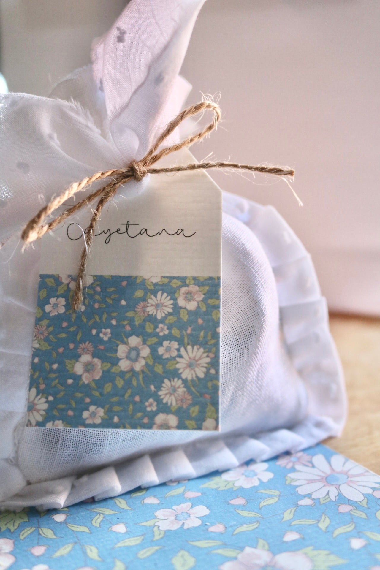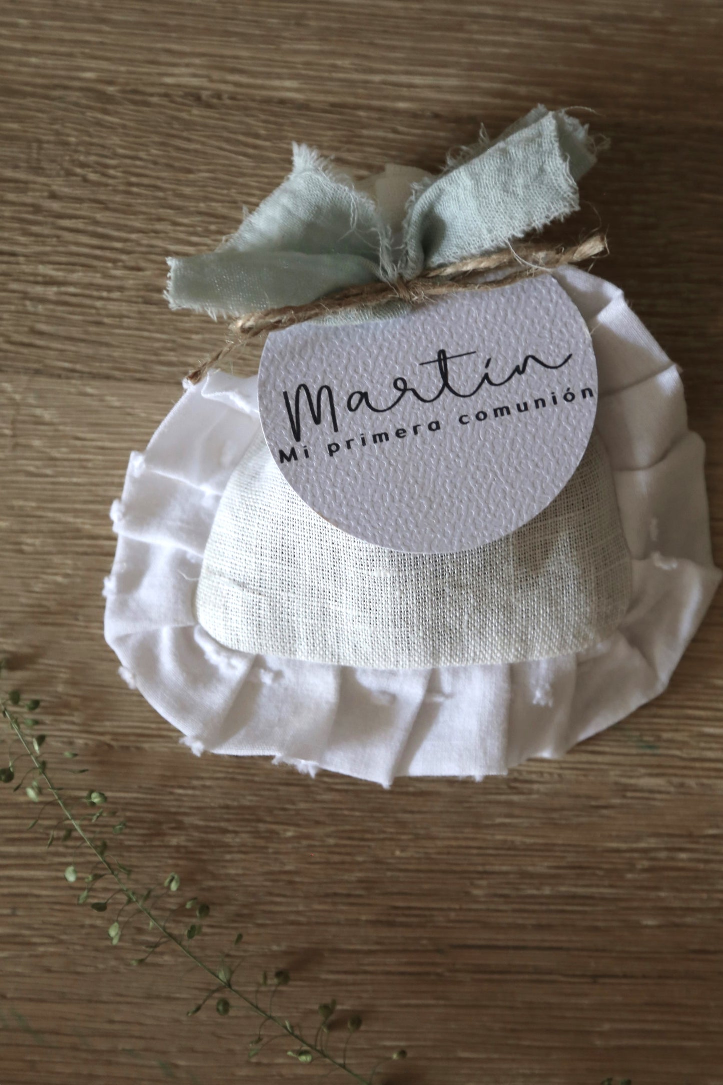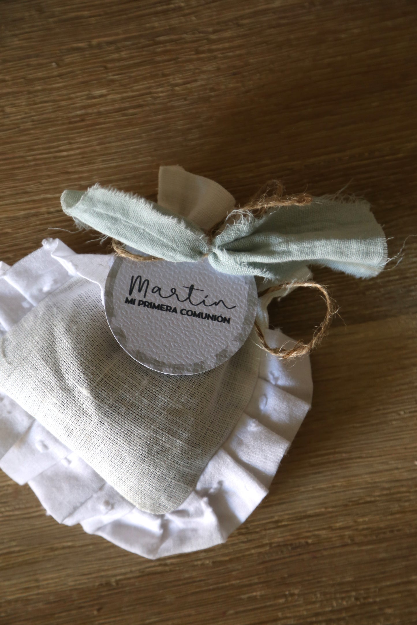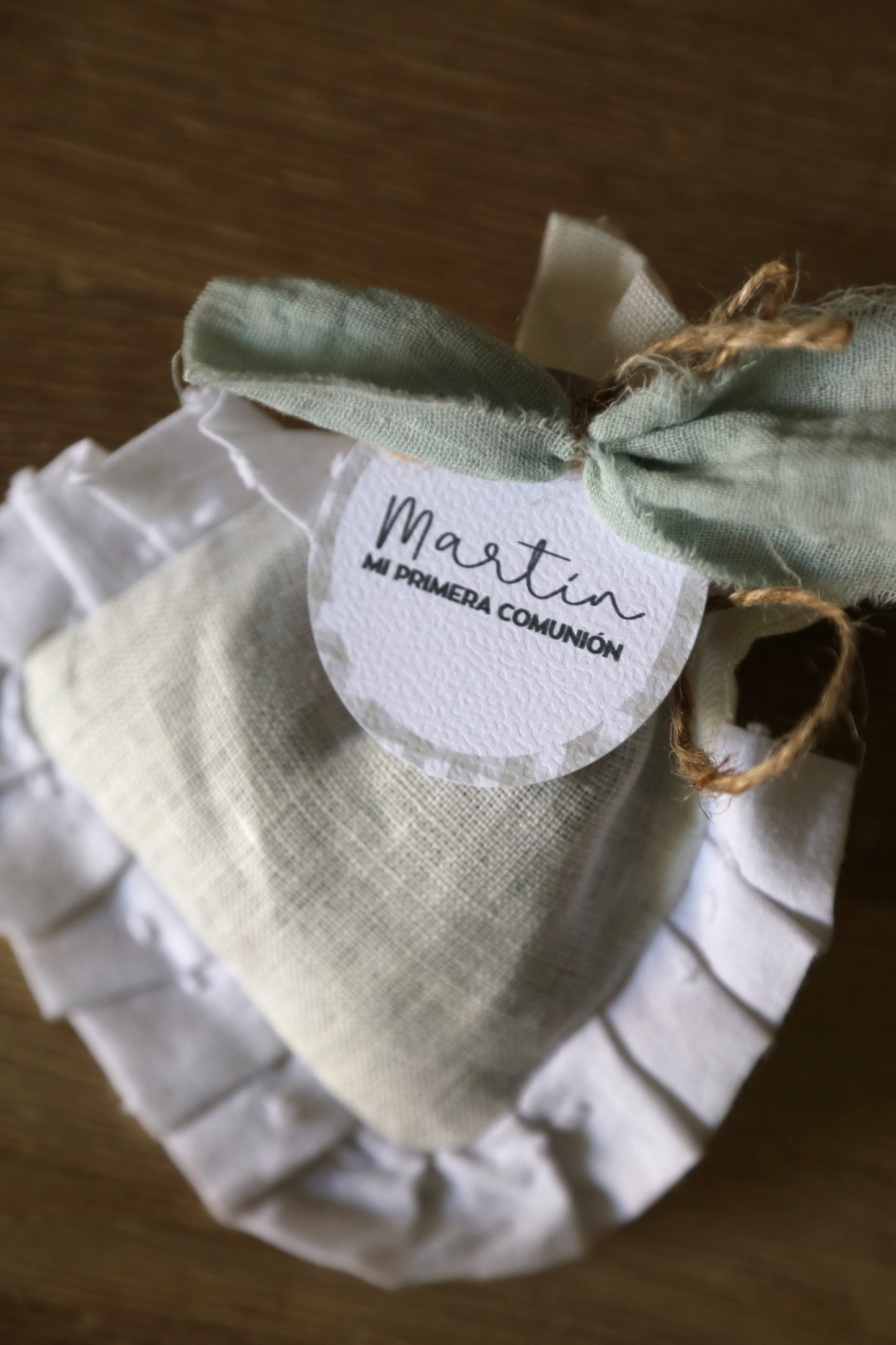 Sorprende a tus invitados con el saquito de lavanda personalizado, diseñado especialmente para comuniones y bautizos. Su aroma a lavanda y su etiqueta personalizada lo convierten en un detalle especial para una ocasión tan única.