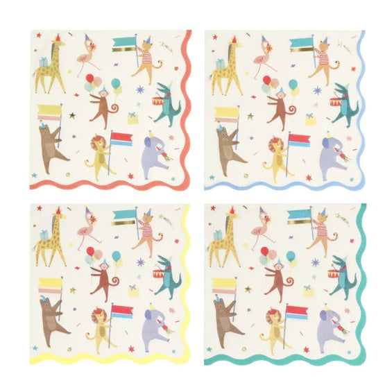 Servilletas desfile de animales 4 colores 33 x 33 cm. Pack 16 u..