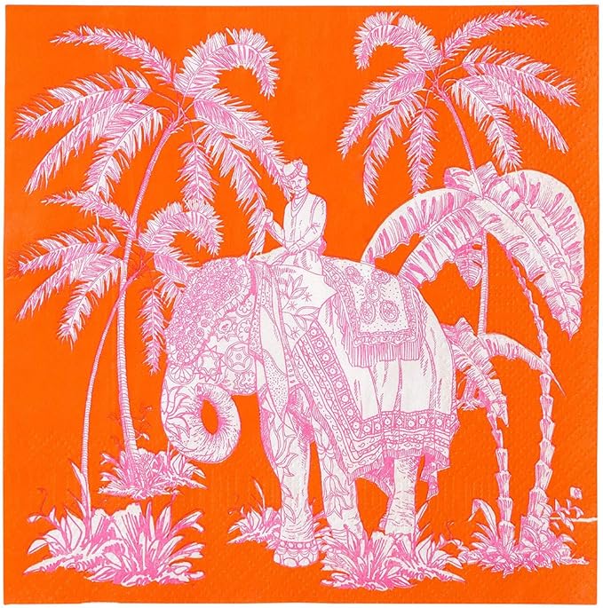 Servilletas grandes con estampado de Elefante naranja y fucsia. Perfectas para darle un toque diferente a tus mesas. Tamaño 33cmx33cm.
