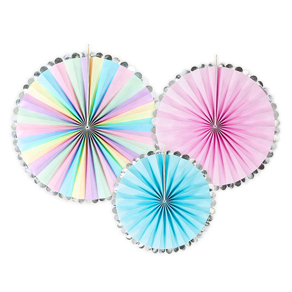 Set de 3 rosetones de medidas diferentes para dar un toque de color y alegría a tu fiesta temática de Unicornio. Son de papel y muy fáciles de montar.