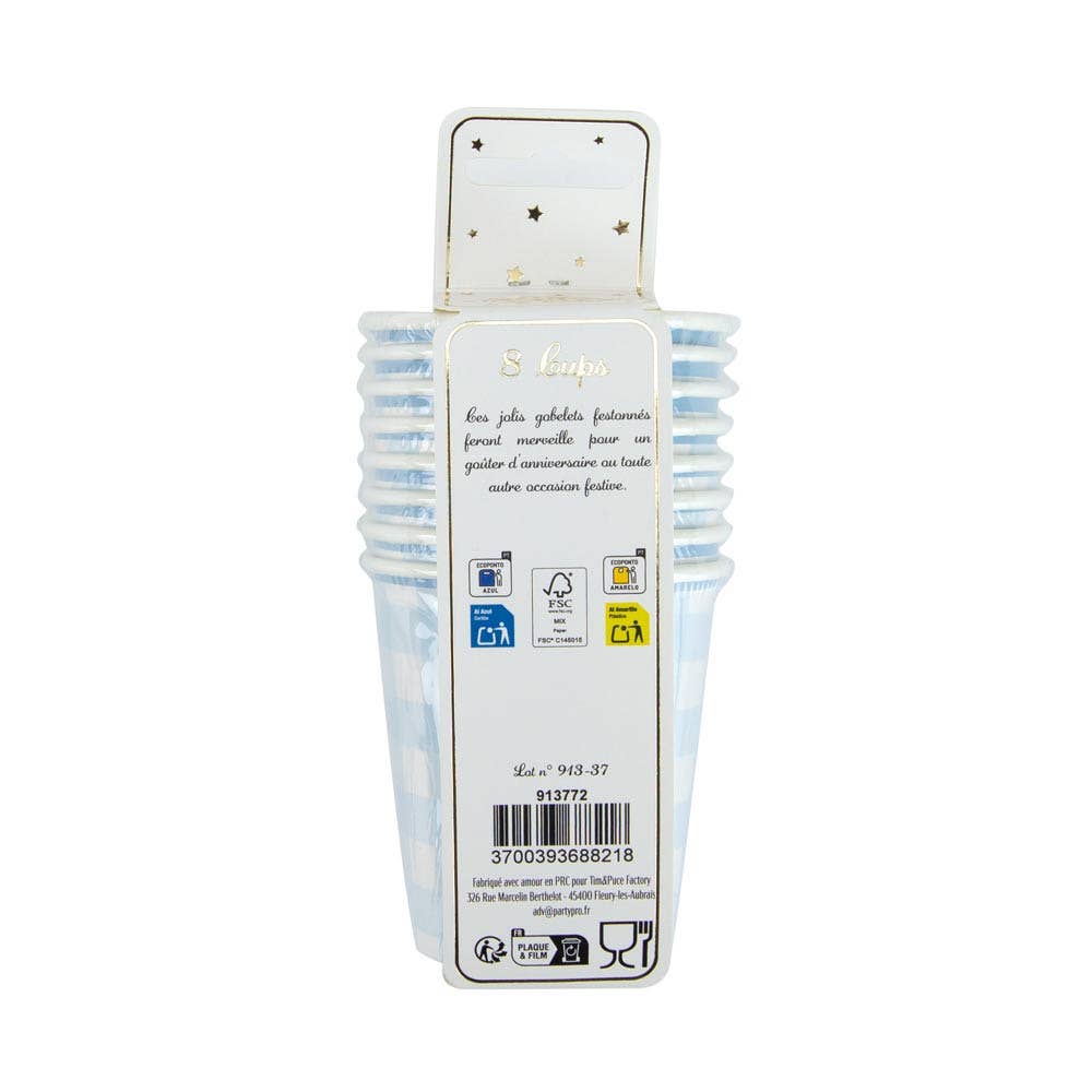 Vasos vichy celeste - Pack 8 uds.|Disfruta de tus bebidas con estos bonitos vasos de cartón con diseño de cuadros vichy azul claro, perfectos para baby shower y bautizos.|Características: Diseño exclusivo Tim&Puce Factory®; Cantidad: Pack de 8 vasos; Capacidad: 200 ml; Material: Cartón 300 g con película impermeable PLA, compostable y biodegradable; Certificación FSC: Producto y embalaje responsables; Ideal para: Baby shower, bautizos o meriendas; Fácil de usar: Listos para colocar bebidas.|Por qué elegir estos vasos: Su diseño delicado y sostenible aporta estilo y cuidado ambiental a tus celebraciones.
